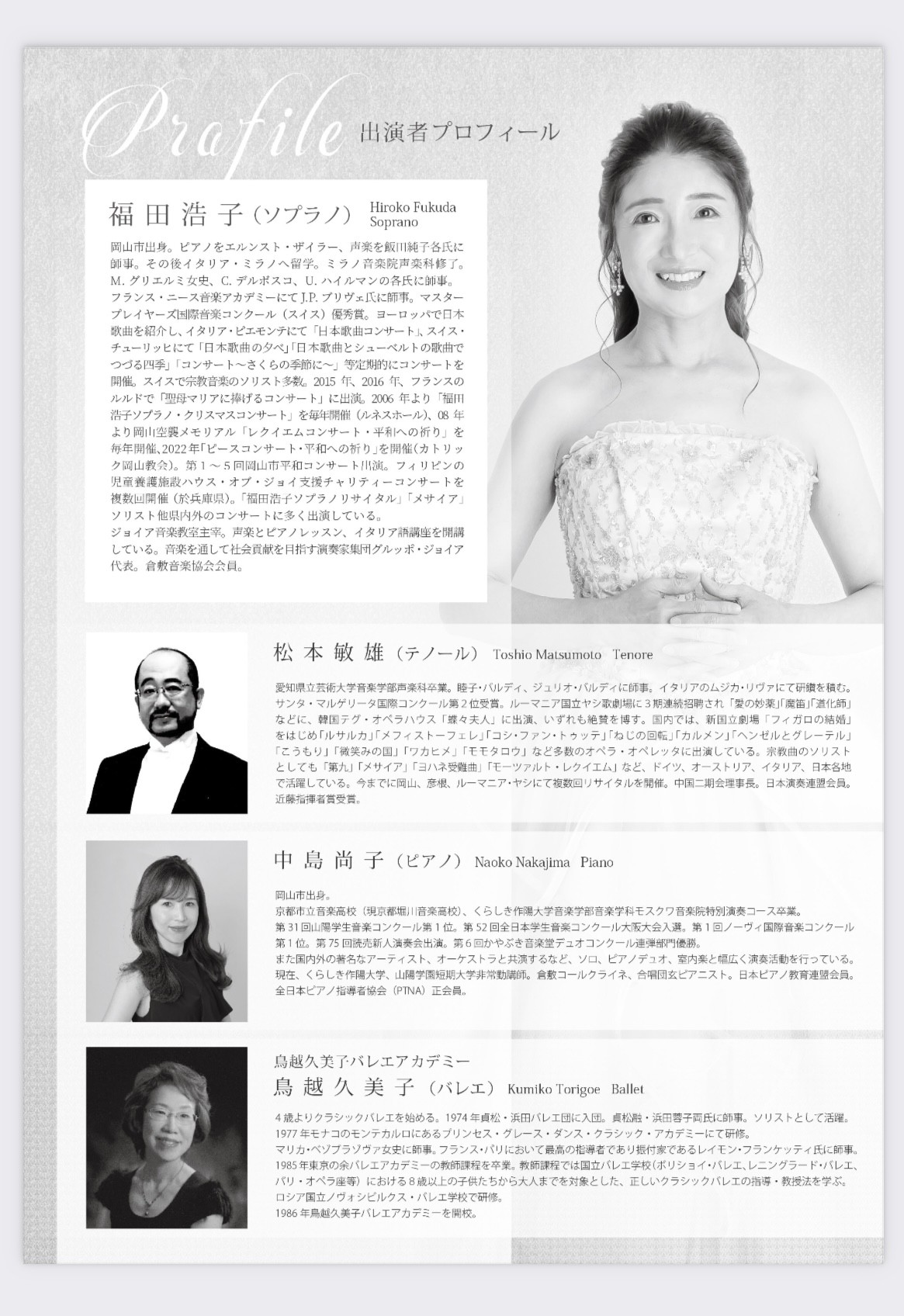・出演 福田浩子(ソプラノ) 有馬雄二郎(テノール) 西川葉(ソプラノ) 大谷麻美(オルガン) 田中有史(オルガン) 岡山天台声明研究会 桃太郎少年合唱団